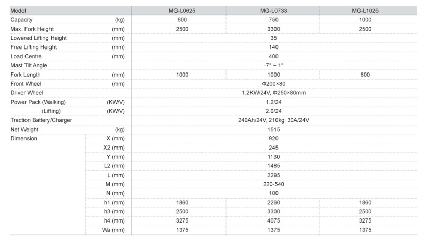 Counter Balance Stacker MG-L0625/MG-L0733/MG-L1025