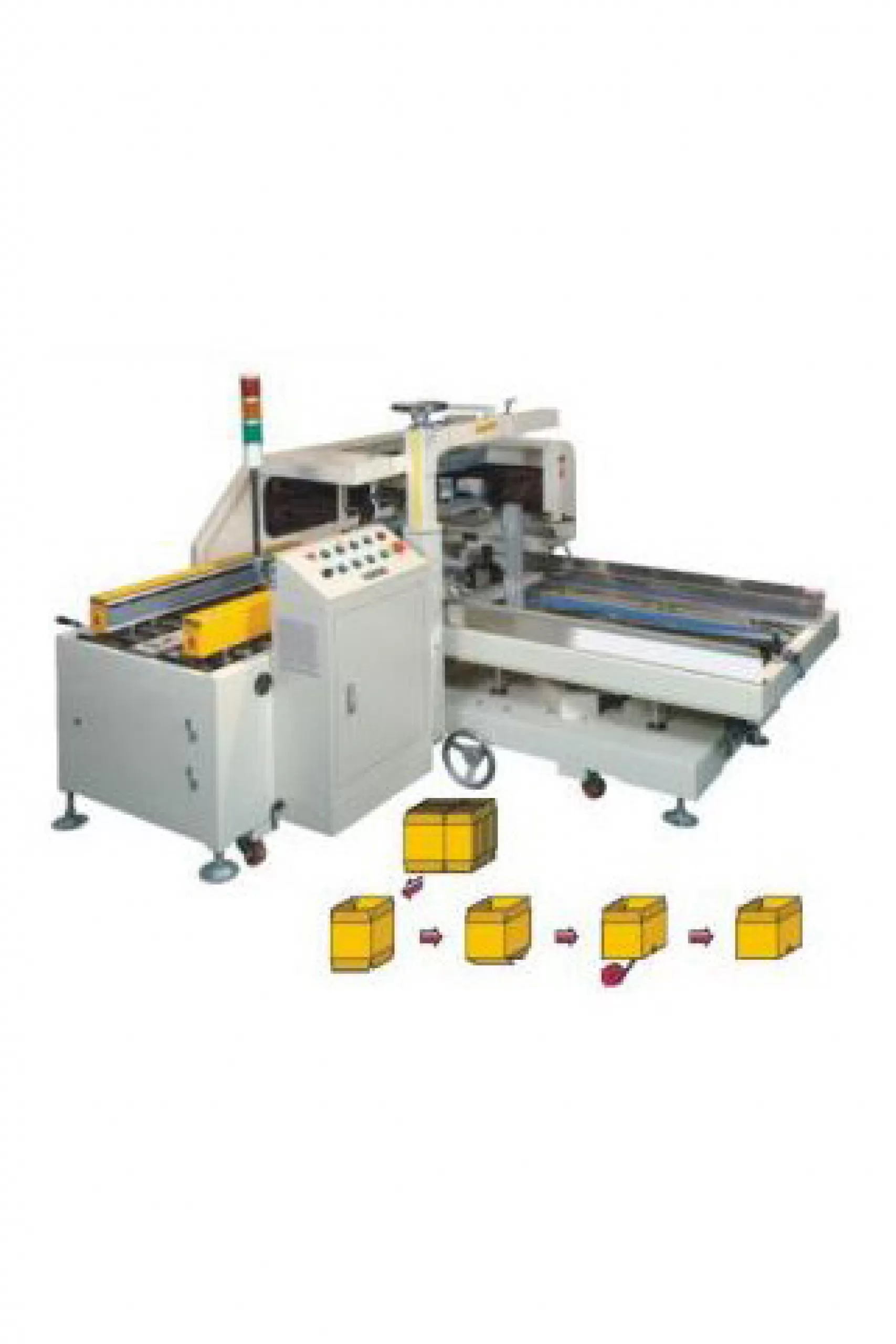 Auto case erector with bottom case sealer with capacity of 6~10 cases per hour.